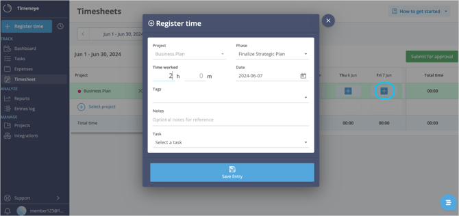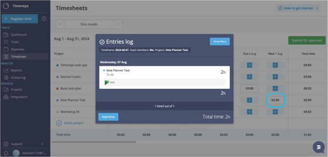 If you need to adjust any existing time entry, simply click on it to open that entry detail. Then, by clicking the pencil icon, you'll be able to edit the time, project, phase etc;