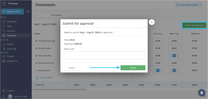 Admins and Owners can submit other users’ timesheets either from the Approvals > Unsubmitted section or from the Timesheets section: