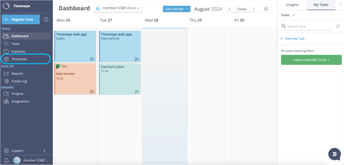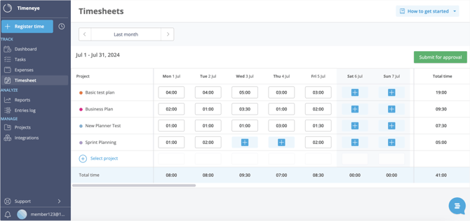 Select the timesheet for the period of time you need to submit. You can already see the time entries that you have tracked as you tracked time in that period (because you have been tracking time regularly, right?);