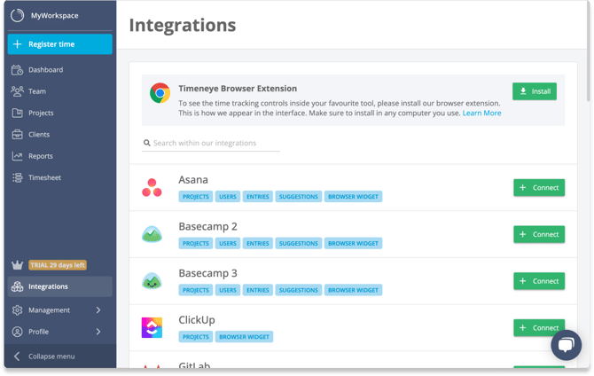 Timeneye offers a wide range of integrations to help you track time directly inside the tools you use on your everyday job.